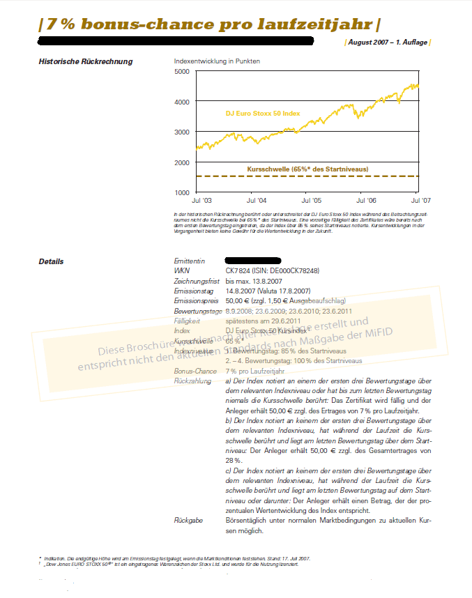Wohlgemerkt: Ich habe weder den Produktprospekt noch das Rückzahlungsprofil vor, in oder nach der "Beratung" vom 03.08.2007 erhalten, mir selbst beschafft oder in der "Beratung" auch nur gesehen. Den Produktprospekt habe ich auf Verlangen in einem Gespräch mit dem Filialleiter am 14.10.2008 - 14 Monate (!) nach der "Beratung" - zur möglichen Rückabwicklung der Transaktion postalisch am 17.10.2008 erhalten. Die Bank hat eine Rückabwicklung der Transaktion (Erstattung meines eingesetzten Kapitals ohne Zinsen gegen Rücknahme der toxischen Papiere) abgelehnt.